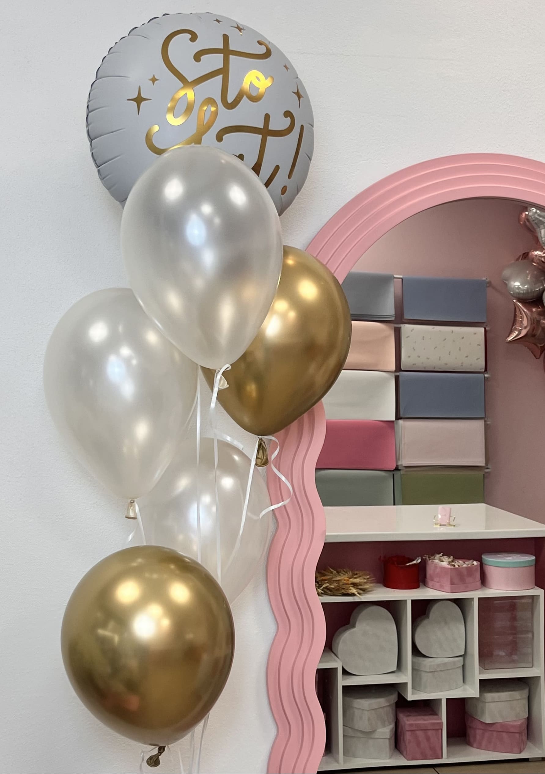 Zestaw 5 lateksowych balonów w kolorach złotym i mlecznym oraz 1 foliowego balonu z napisem „Sto Lat”