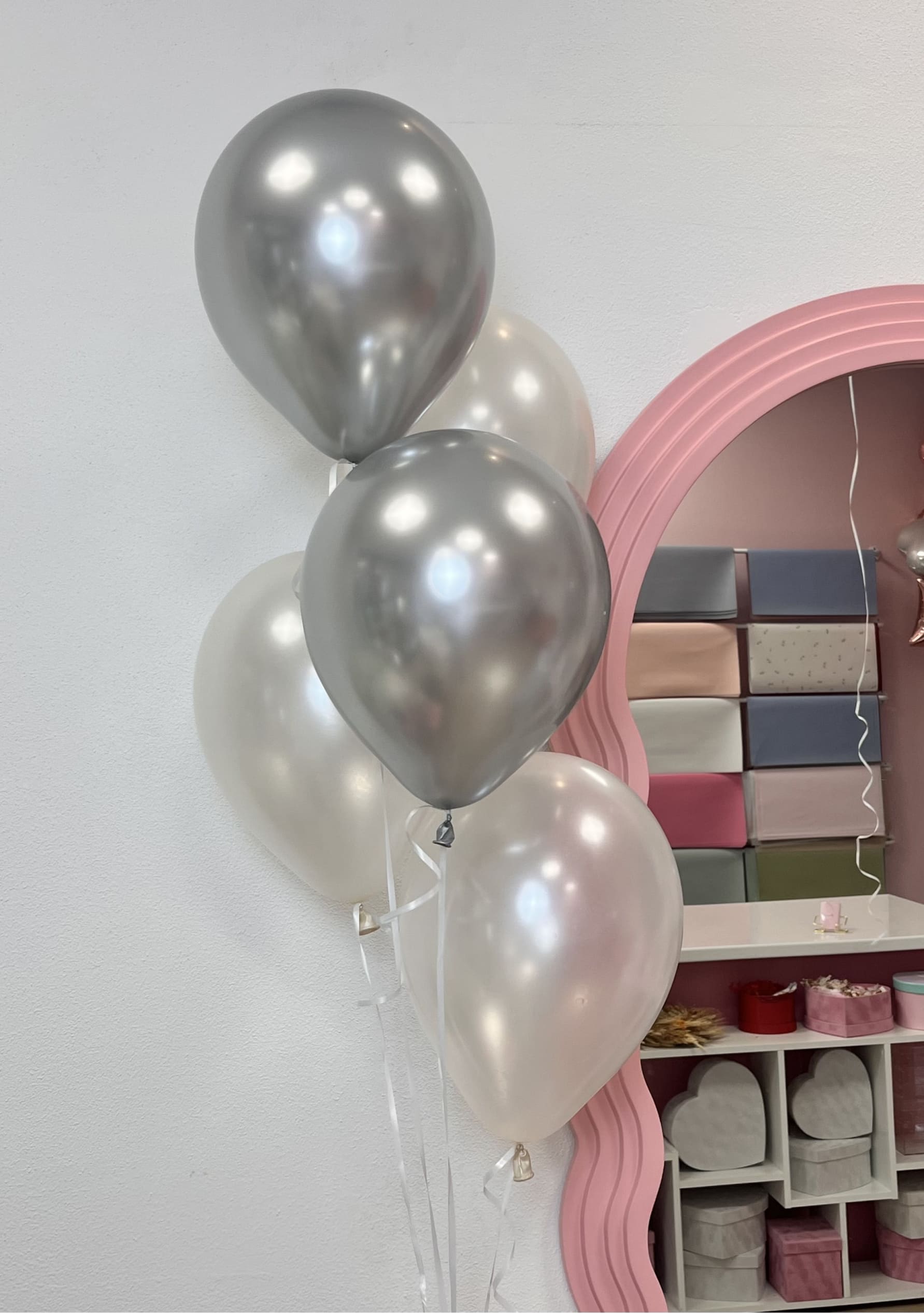 Zestaw 5 lateksowych balonów nadmuchanych helem w kolorach mlecznym i srebrnym