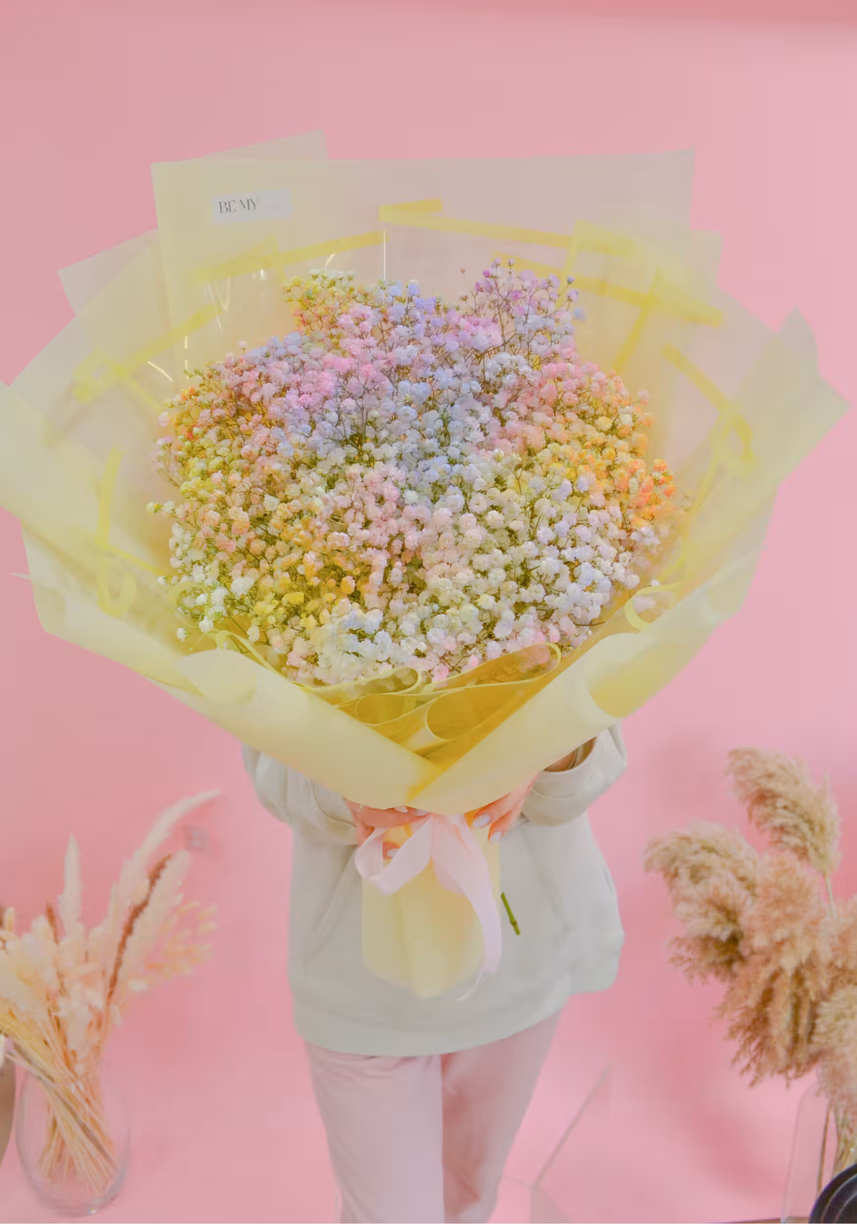 Na zdjęciu jest przedstawiony bukiet z kolorowej gipsówki w rozmiarze M.